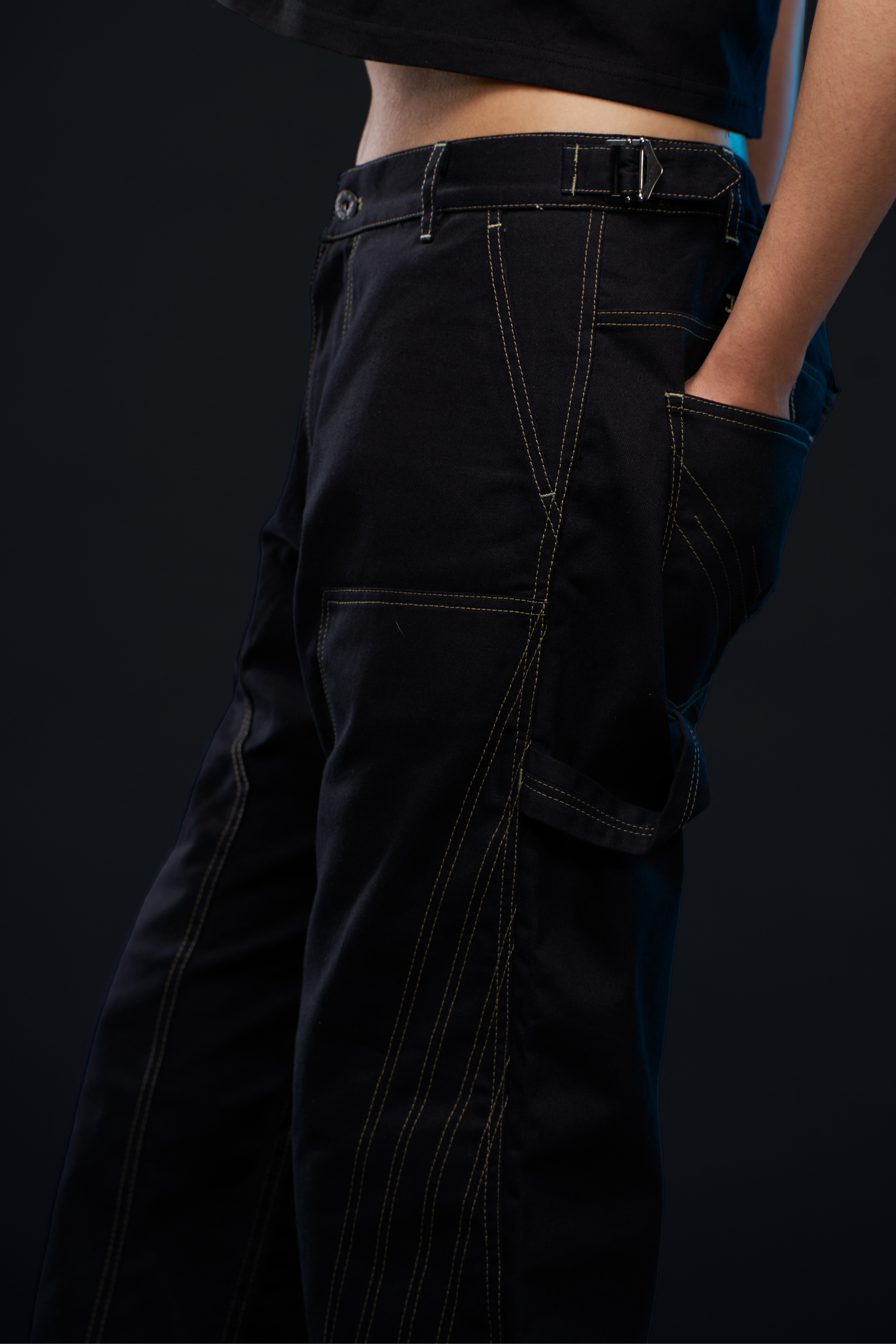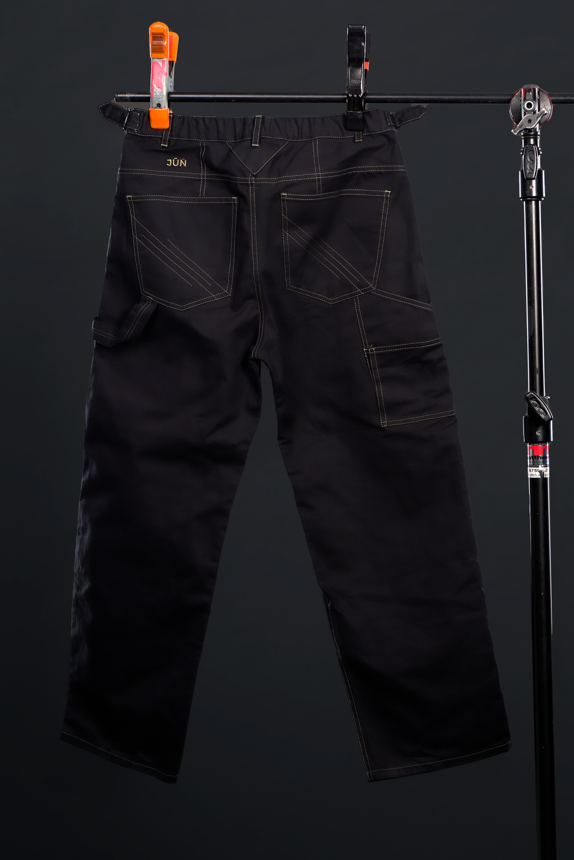 JŪN’s RIG. pants reinterpret classic carpenter pants with modern functionality and elevated detailing. Designed with an elastic waistband and adjustable side tabs with fasteners, they offer a customizable fit while maintaining a clean, structured silhouette.