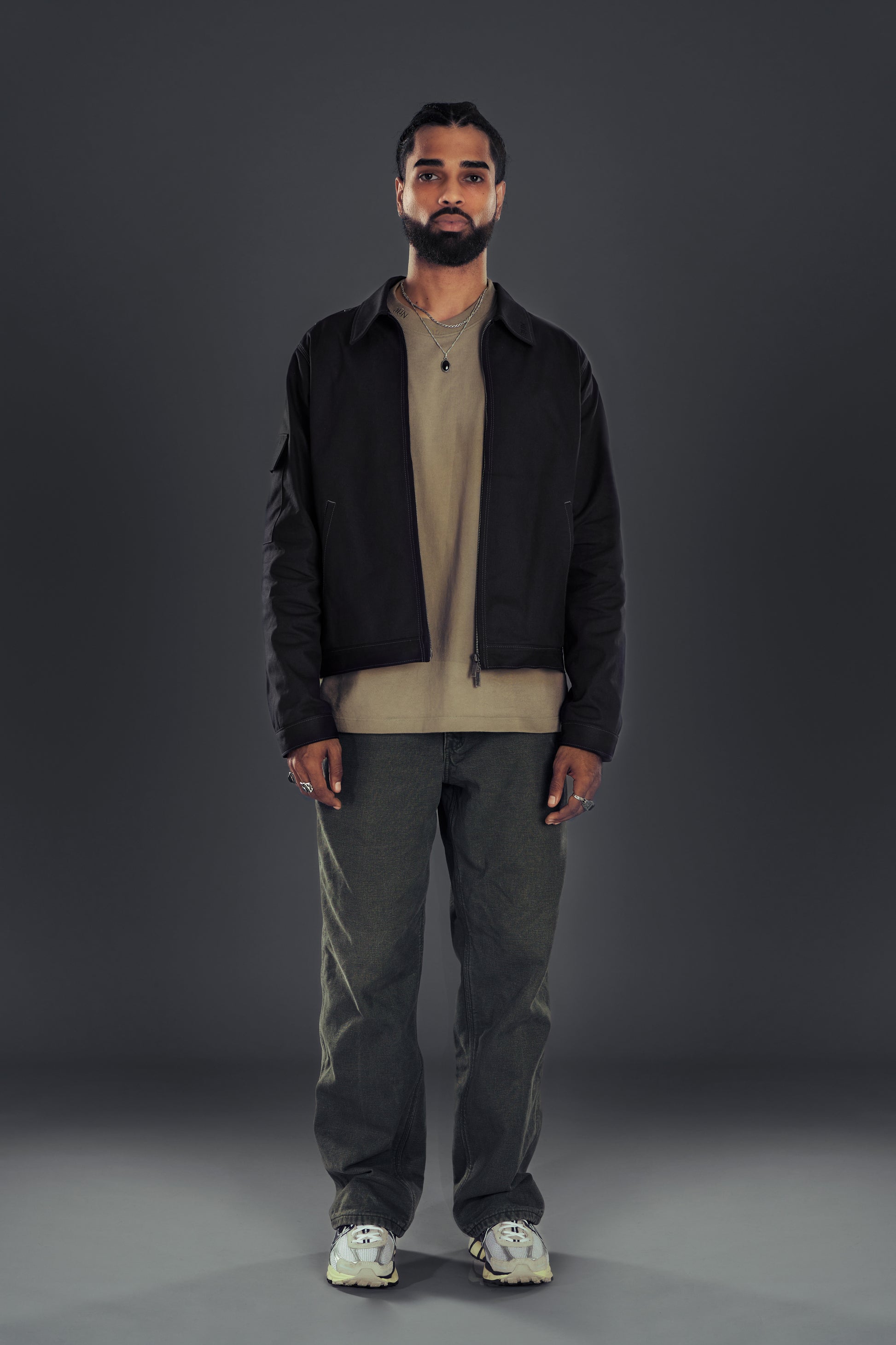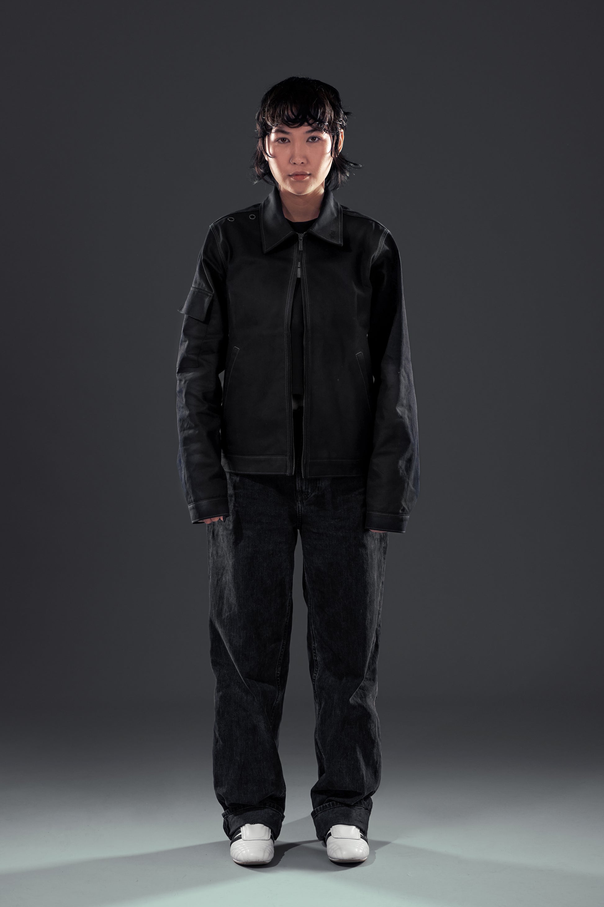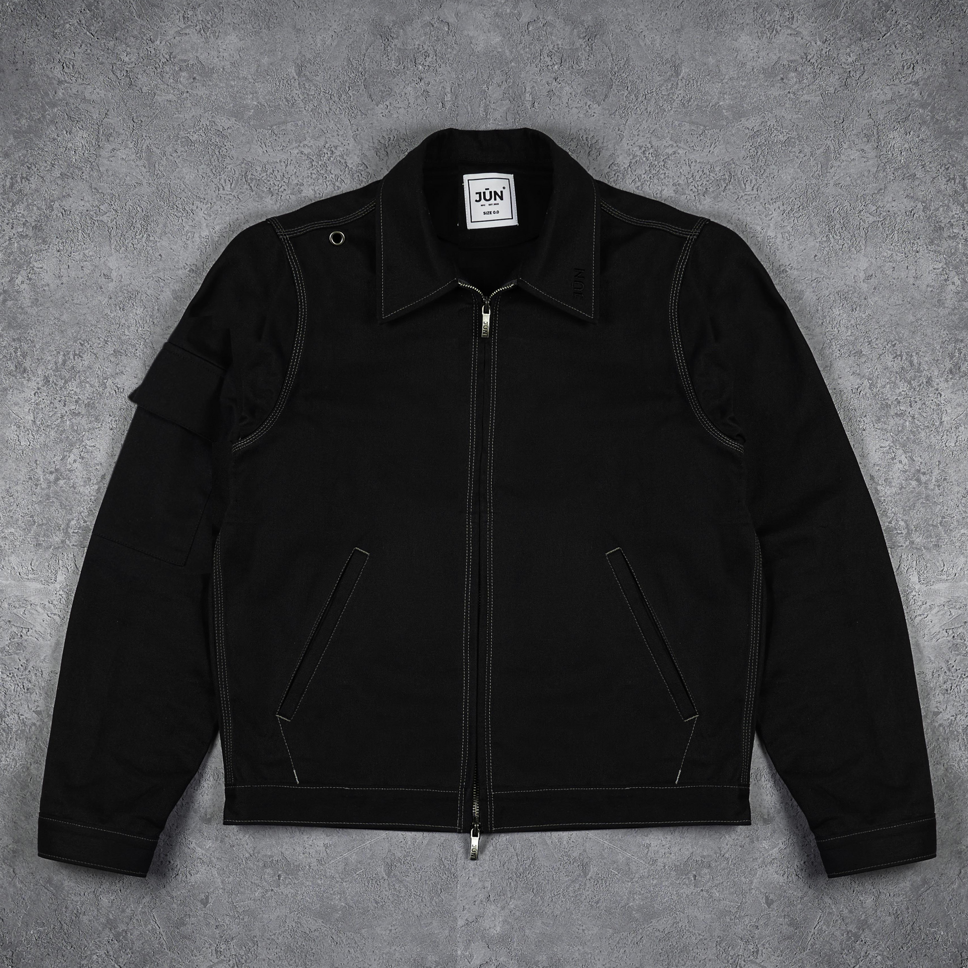 “The Ike Jacket — our take on the classic workwear silhouette, reimagined as a modern staple. Made from heavy 100% cotton Mason twill in deep black, it’s built to last and designed with intention. Hidden embroideries on the collar and sleeve add quiet detail, while our signature eyelets on the shoulder and back connect it to the rest of the JŪN world. Finished with a custom logo zipper that glides smooth — every element, considered.”